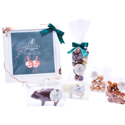 2 stk. marcipangrise, mørk med klassisk marcipan overtrukket med mørk chokolade. Lakridsmarcipan overtrukket med hvid chokolade. Blandet chokolade pebernødder og 2 varianter af 45 g. dragée
